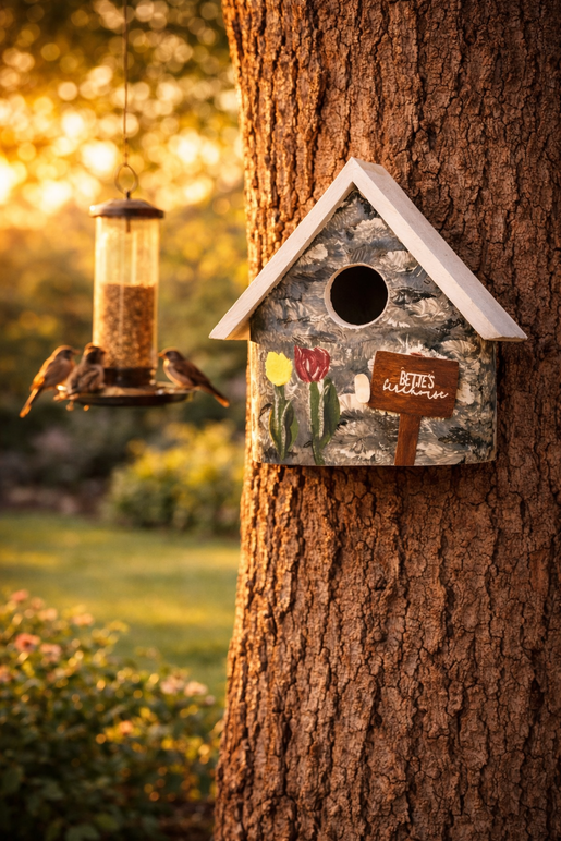 This project is great for all ages! A fun afternoon activity for the kids, a craft project for seniors, these bird houses will bring smiles to faces, and once they're done, they'll bring even more happiness! Not only will they look adorable out on display, they are usable birdhouses, so you might find some feathered friends to enjoy them!