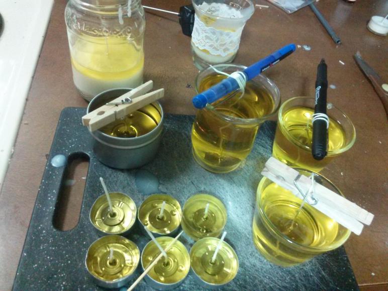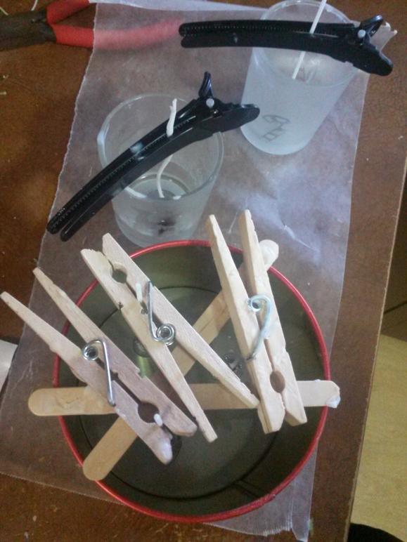 If your budget allows, spend the money to invest in some metal candle wick centering devices. I bought a pack of four after I made my first couple batches of candles and they are very helpful. But I find I often make more than four at a time so you’ll see in my pictures some of my alternative wick centering methods that I’ve used when I’ve run out. My favorite is the wooden clothes pin method, but I’ve also used pens, popsicle sticks, hair clips and other similar items. If you’re using a non-waxed wick, you can simply wrap the end a couple of times around the middle of a pencil and balance the pencil across the opening of the candle holder. (You won’t need to do this if you’re only making tealights using pre-waxed and tabbed wicks.)