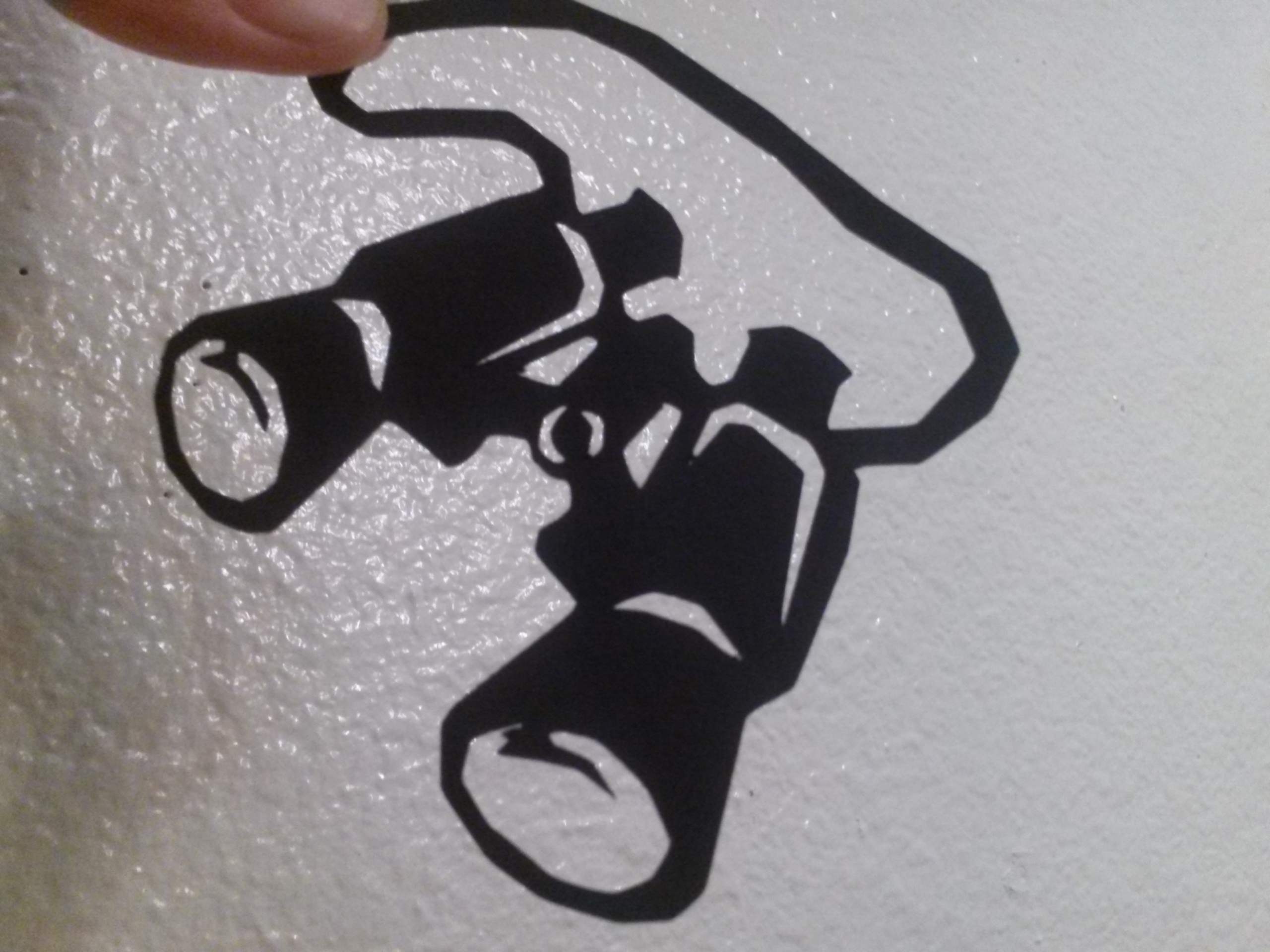 Since I didn't have any spot light die-cuts, I used a pair of binoculars from Cricut's "Camp Out" cartridge (3 1/2" tall) -- just cut them down with scissors to create two spot lights from each pair.