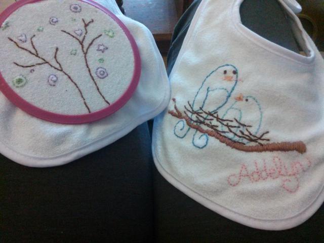 My mom bought me a couple of Doodle Stitching books by Aimee Ray a while back that I had looked through dozens of times but only tried out once or twice. They were filled with adorable designs! Other than throwing a piece of scrap fabric on a hoop and playing around, or decorating a couple of premade baby bibs a few years back (pictured below) I hadn’t really tried my hand at very many embroidery projects, and definitely didn’t know more than 3 different stitches!