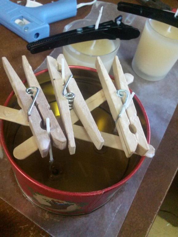 If your budget allows, spend the money to invest in some metal candle wick centering devices. I bought a pack of four after I made my first couple batches of candles and they are very helpful. But I find I often make more than four at a time so you’ll see in my pictures some of my alternative wick centering methods that I’ve used when I’ve run out. My favorite is the wooden clothes pin method, but I’ve also used pens, popsicle sticks, hair clips and other similar items. If you’re using a non-waxed wick, you can simply wrap the end a couple of times around the middle of a pencil and balance the pencil across the opening of the candle holder. (You won’t need to do this if you’re only making tealights using pre-waxed and tabbed wicks.)